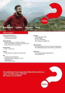 Ab Januar 2026 startet zum wiederholten Male ein Alpha-Glaubenskurs in unserer Seelsorgeeinheit. Alpha ist eine Reihe von Treffen in entspannter Atmosphäre. Bei jedem Treffen werden Fragen rund um das Leben und den christlichen Glauben thematisiert.