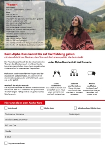 Wer einfach neugierig ist, eine Sehnsucht nach Mehr im Leben verspürt oder die Sache mit Gott nochmals neu für sich ausprobieren möchte, ist bei hier am richtigen Platz. Während zehn Wochen beschäftigen sich die Gäste mit Themen wie „Wer ist Jesus?“, „Was kann mir Gewissheit im Glauben geben?“ oder „Wie führt uns Gott?“.