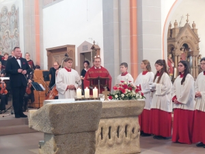 Der feierliche Gottesdienst wurde mit der Messe „Missa Laetatus sum“ von Johann Valentin Rathgeber mit dem Kirchenchor St. Pelagius, Solisten und Intrumentalisten aus der Region unter der Leitung von Axel Zimmermann glanzvoll gestaltet. Am feierlichen Ende vereinigte sich alle anwesenden Musiker mit der ganzen Gemeinde zum Schlusslied „Großer Gott wir loben Dich“ Dieser kraftvollen Lobgesang war durch das offene Portal der Pelagiuskirche weithin zu hören.