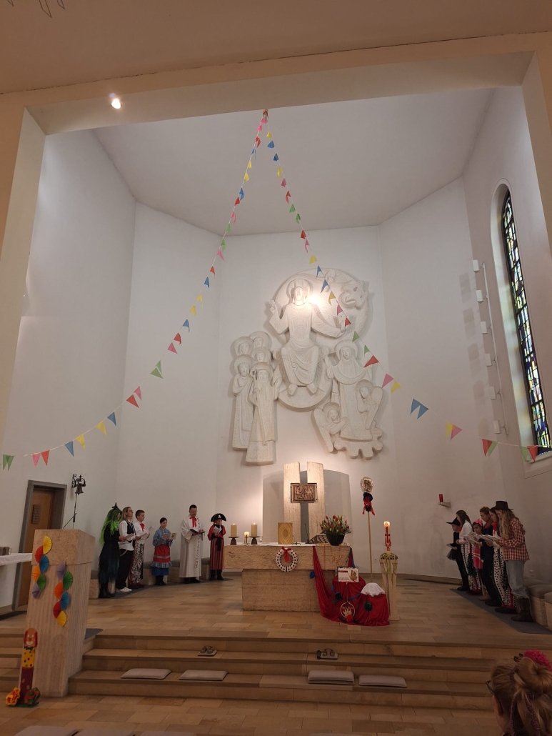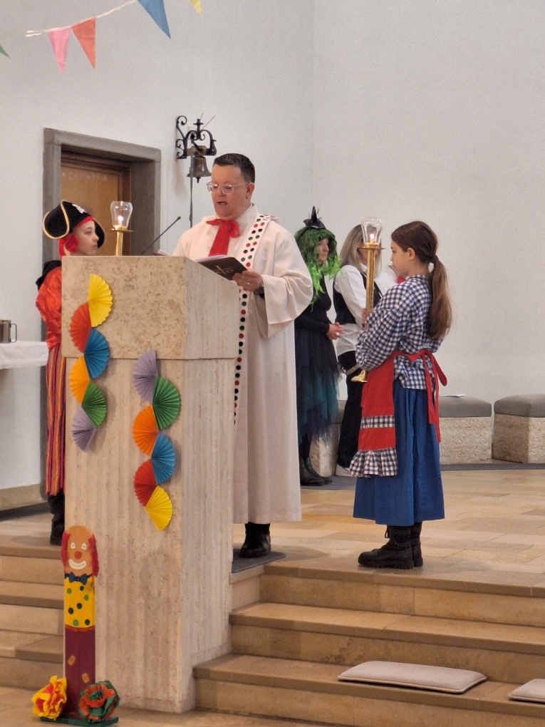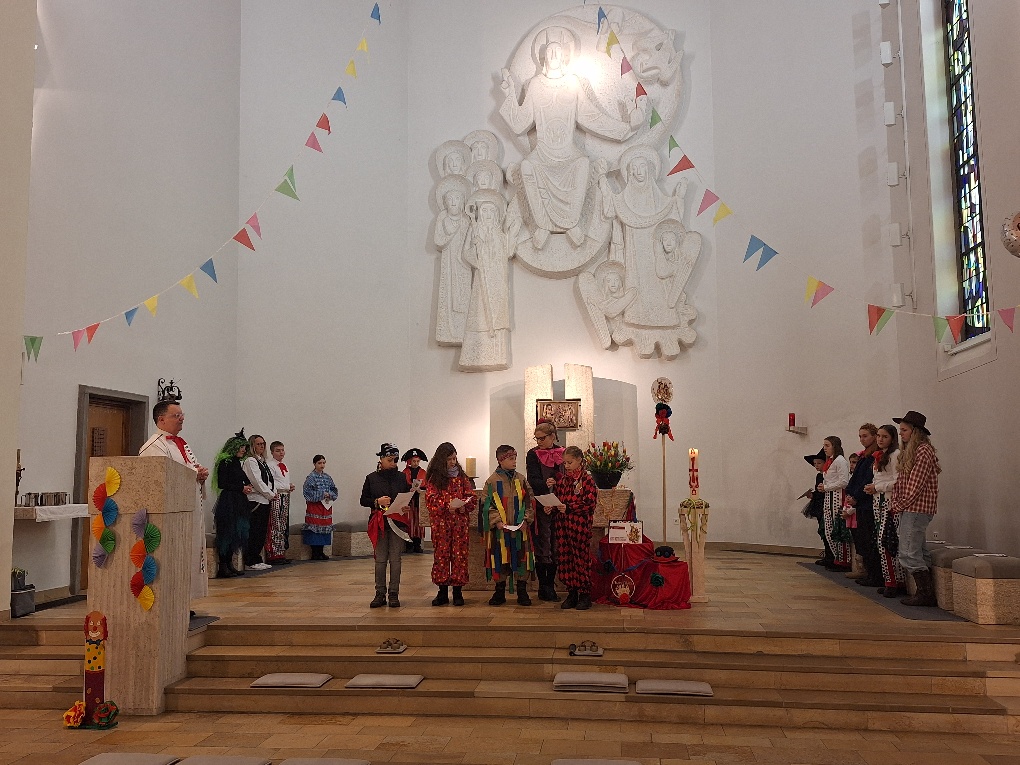 Der WGF-Leiter eröffnete die Feier und begrüßte die Narrenschar zur bunten Fasnetszeit. Die Erstkommunionkinder, Ministranten sowie Närrinnen und Narren wirkten aktiv mit, indem sie Texte vortrugen und so das liturgische Geschehen lebendig gestalteten. Eine Premiere gab es ebenfalls: Heiko Leibold präsentierte ein eigenständig erstelltes Narrenbuch sowie einen Narrenhut, die er bei der Narrenpredigt einsetzte. Aus dem Narrenbuch wurde die Narrenpredigt vorgetragen, die sich thematisch am Evangelium „Menschenfischer“ orientierte. Der aktuelle Prozess zur Raumschaften und zur Kooperation mit anderen Seelsorgeeinheiten durfte auch nicht fehlen.
